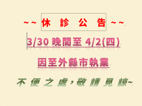 ~ ~ 休 診 公 告 ~ ~ 3/30晚間至4/2(四) 因至外縣市執業 不 便 之 處,敬 請 見 諒~